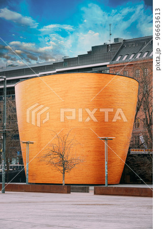 The wooden facade of church The Kamppi Chapel in Helsinki is also known as Chapel of Silence.