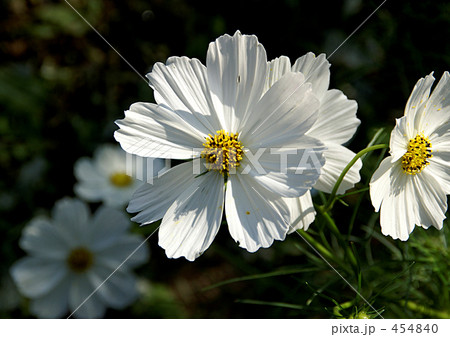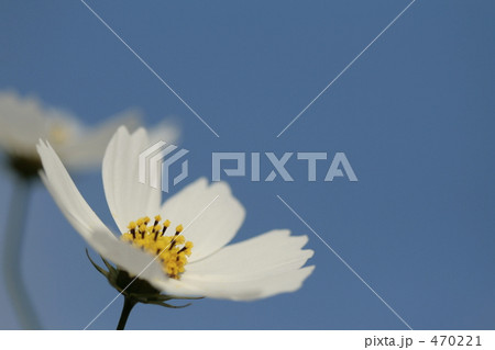 白いコスモスと青空 透過光 ピンクの前ボケ