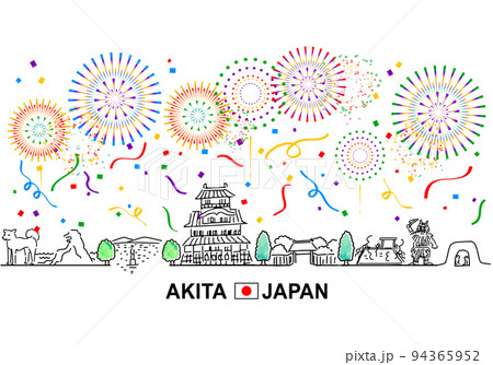 秋田県の観光地の街並みと5色の花火と紙吹雪