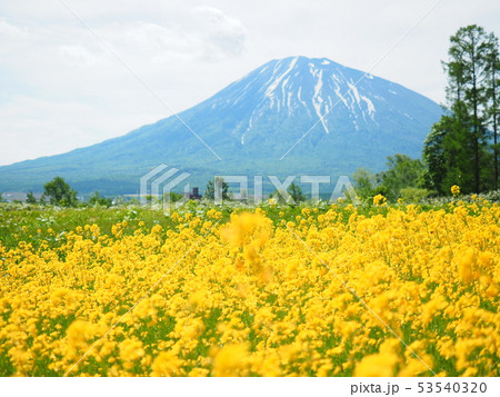 初夏の北海道倶知安町で残雪の羊蹄山と菜の花の風景を撮影