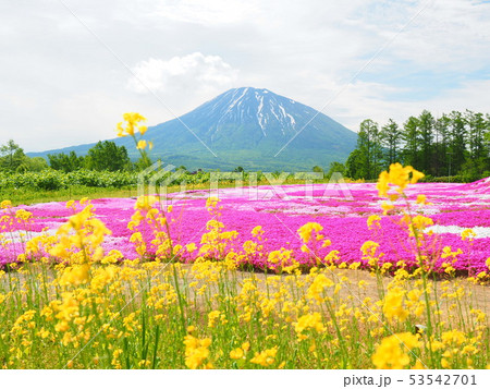 北海道の風景 羊蹄山と菜の花と芝桜庭園