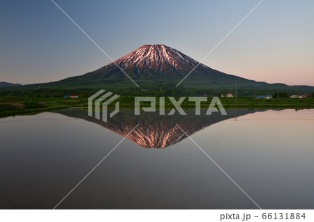 初夏の北海道倶知安町で残雪の羊蹄山と水田に映る逆さ羊蹄山の朝焼けの風景を撮影