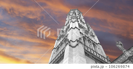 Great gothic church of Saint Germain l Auxerrois (against the background of a sky at sunset), Paris, France