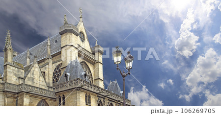 Great gothic church of Saint Germain l Auxerrois (against the background of sky with clouds), Paris, France