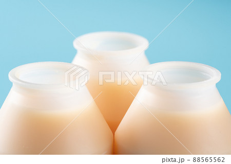 Small bottles with probiotics and prebiotics dairy drink on blue background. Production with biologically active additives. Fermentation and diet healthy food. Bio yogurt with useful microorganisms.