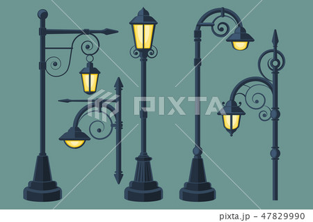 Lamppost in retro style,modern lantern, torch and other types of streetlights. Lamppost set