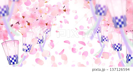 夜の桜並木と幻想的な提灯の光 お花見の背景イラスト