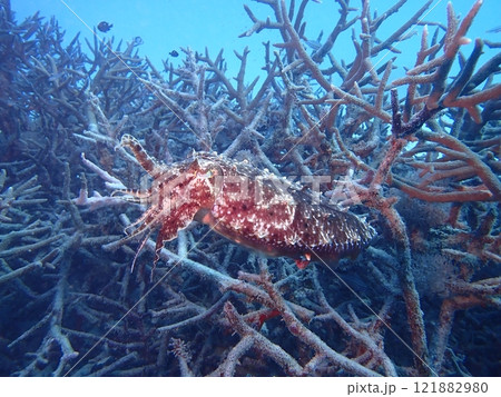 枝状のサンゴの上を泳ぐイカのコブシメ