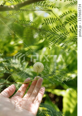 手のひらの上にあるギンネムの白い球状の花