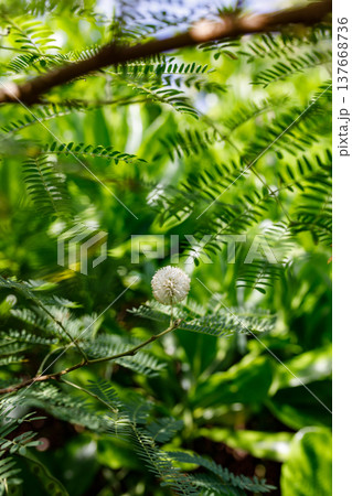 緑の葉に囲まれたギンネムの白い球状の花