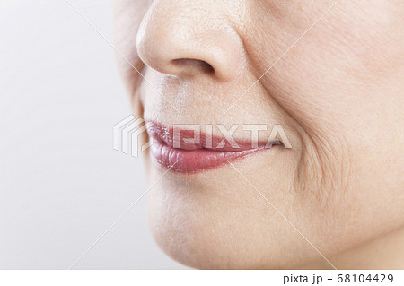 Close-up Beautiful lips. Part of face, young asian woman close up. Sexy plump lips Nude lipstick