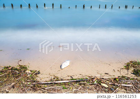 夏の琵琶湖の湖岸に打ち上げられた魚の死骸を長時間露光で撮影した景色