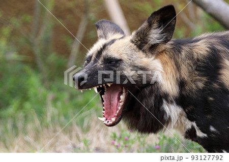 口を大きく開くリカオンのポートレート