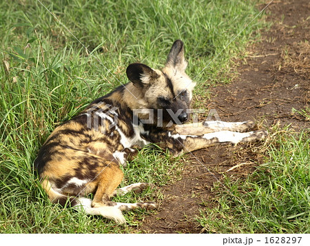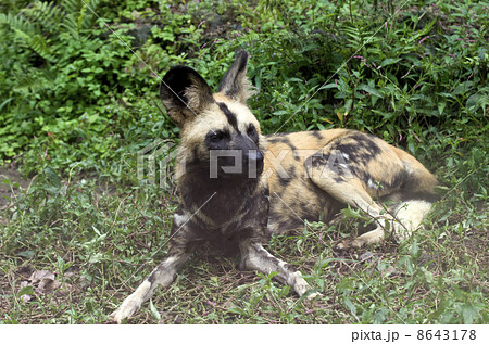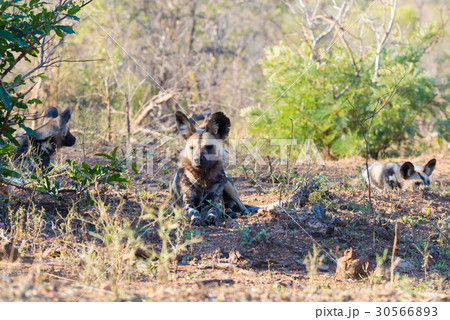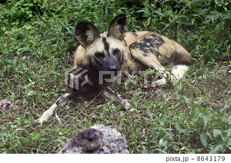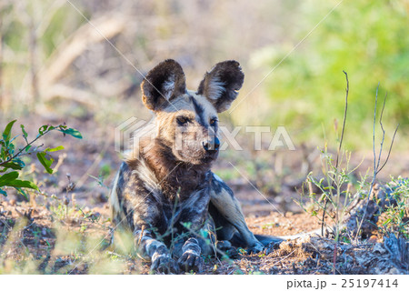 Wild Dog or Lycaon lying down in the bush