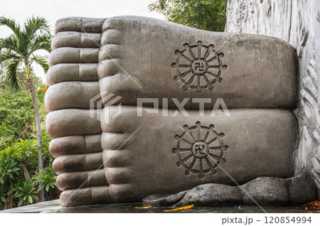 heels of big Buddhist statue of lying Buddha at Long Son Pagoda in Nha Trang in Vietnam in Asia