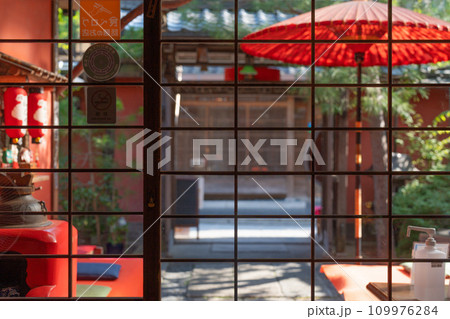Red parasol at restshop 赤い和傘のあるお休み処・甘味処(春の歌会・観桜会)