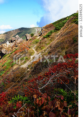 登山道に建つ鳥居 谷川連峰 秋の山岳風景