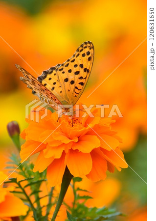 満開のマリーゴールドと蝶