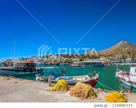 港に係留するボート (ギリシャ、クレタ島、エロウンダ)