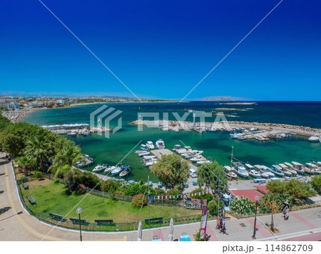 ホテルから見渡すエメラルドグリーンの海のマリーナ (ギリシャ、クレタ島、ハニア)