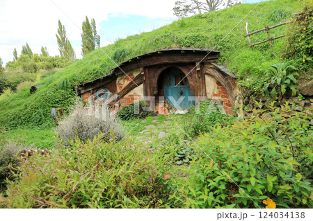 The red door in front of Hobbit hole in Hobbiton movie set in Matamata, New Zealand.