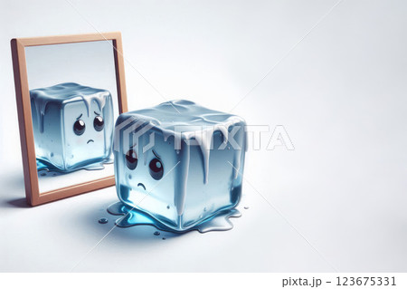 A sad melting ice cube looks in the mirror. Space for text.