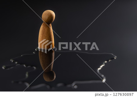 A wooden peg doll stands alone, staring down at its reflection in a puddle. Symbolizes symbolizing mental health crisis, deep depression, stress, and emotional pressure