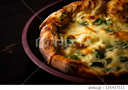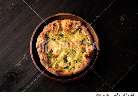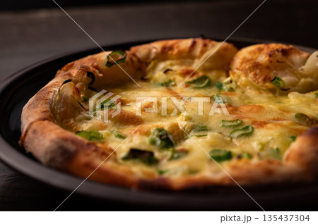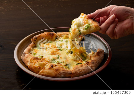 《伸びるチーズを持ち上げる焼きたてピザ》