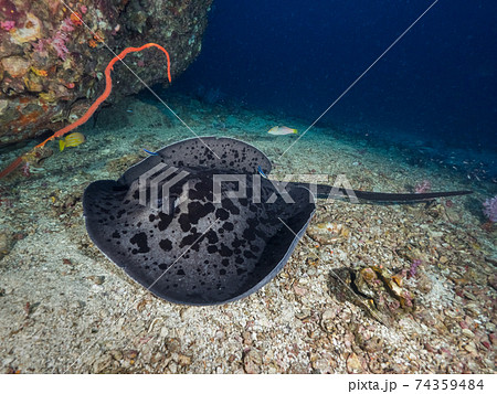 珊瑚礁の砂地で休むマダラエイ (メルギー諸島、ミャンマー)