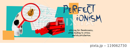 Contemporary art collage. Man with magnifying glass, inspecting papers, striving for flawlessness, often leading to stress and dissatisfaction.