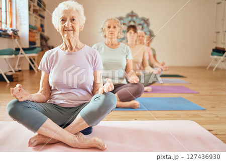 Yoga, exercise and senior woman in lotus for meditation, mindfulness and zen workout for health and wellness in retirement. Group of old people together yoga spiritual, chakra and balance training