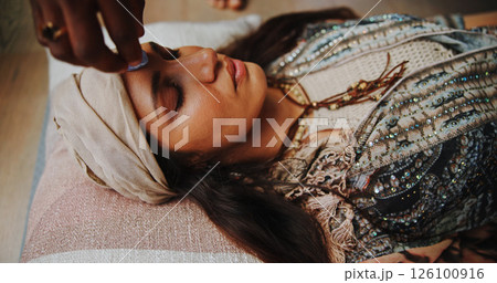 Female practitioner performs facial lifting technique on a young woman lying on a couch. Concept of energy healing, face therapy and alternative wellness practice from Access Bars.