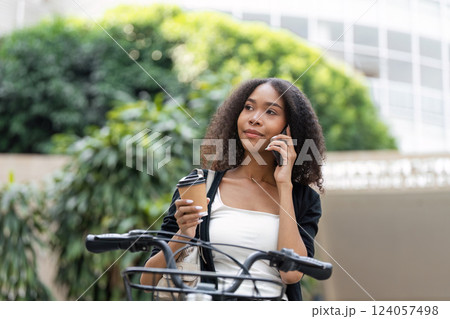 Reflective Moments with Coffee and Connectivity. A woman on the phone, sipping her coffee next to her bicycle.