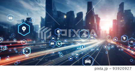 車の行き交う交差点と通信ネットワークのコンセプト