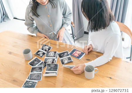 リビングでエコー写真を見ながら赤ちゃんが生まれてくるのを待ち望んでいる母と娘