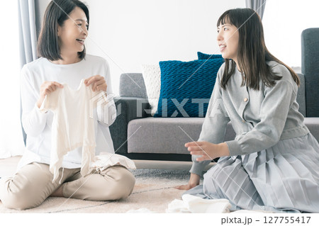 出産準備をしながら明るい未来の話をする母と娘