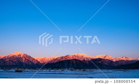 【朝焼け素材】朝焼けした北アルプスと青空【長野県】