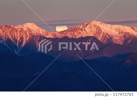 竜ヶ岳から見る朝焼けの白峰三山に沈む満月