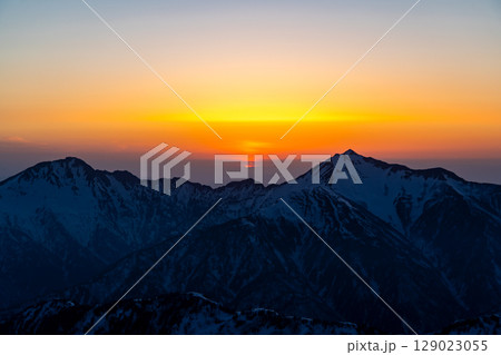 冬の北アルプスの夜明け モルゲンロート