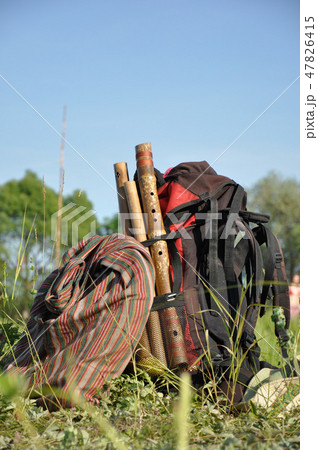 Touristic backpack standing on grass