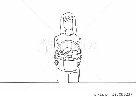 Single continuous line drawing woman carrying wicker basket filled with piles of mushrooms. Harvest not as expected. Weather is unpredictable. Day of the Mushroom. One line design vector illustration
