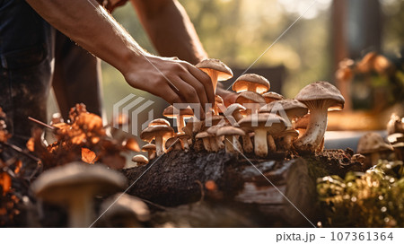 Organic and Sustainable Cultivation of Mushrooms. Collecting mushrooms from the ground in the air natural habitat