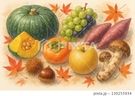 秋のイメージ、野菜や果物や動物などのイラスト素材