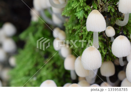 密集して成長するニクウスバタケ茸のコロニー(自然環境下菌・キノコ類マクロ撮影)