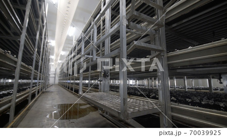 Champignon production farm. Shelves rows. Shampion grown mushrooms. Modern agriculture