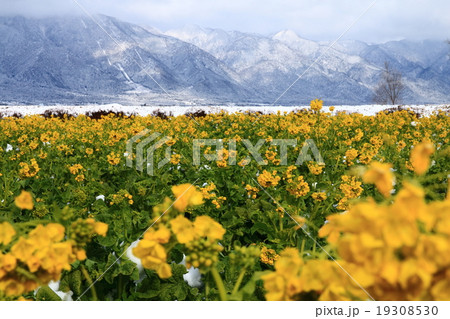 滋賀県守山市のなぎさ公園に広がる菜の花畑と雪の残る比良山