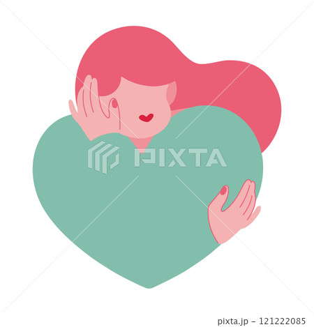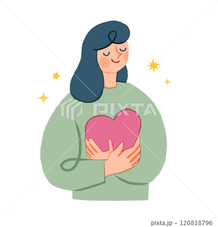 ハートを持つ若い日本人女性のイラスト。思いやりイメージ素材