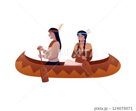 Vector illustration of native americans in canoe, isolated background.