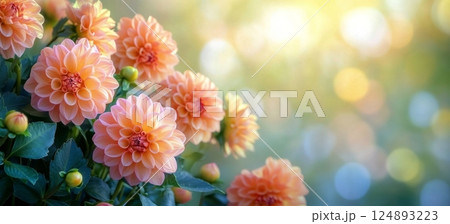 Beautiful dahlia flowers bloom in a colorful garden during the golden hour of evening light