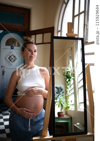 Pregnant woman in casual clothes, reflected in a mirror, surrounded by natural light